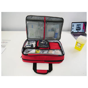 Su espacio principal es modular y contiene 4 compartimentos extraíbles con cremallera (fijados con velcro): 3 transparentes para identificar rápidamente el contenido y 1 aislante, provisto de su bolsillo reutilizable para gel frío, para introducir hasta 20 ampollas.