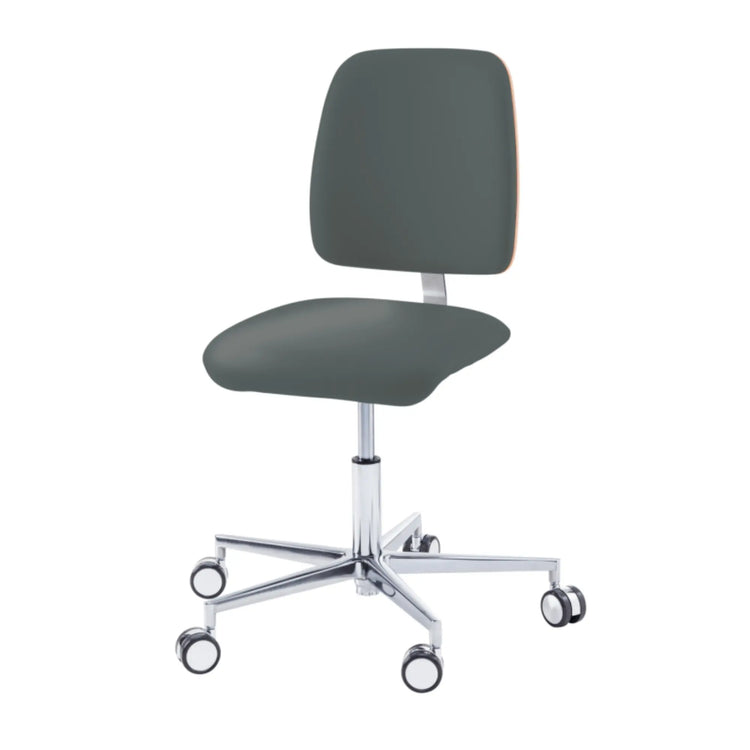 Stool with comfortable, padded seat. Aluminum base with self-braking casters.