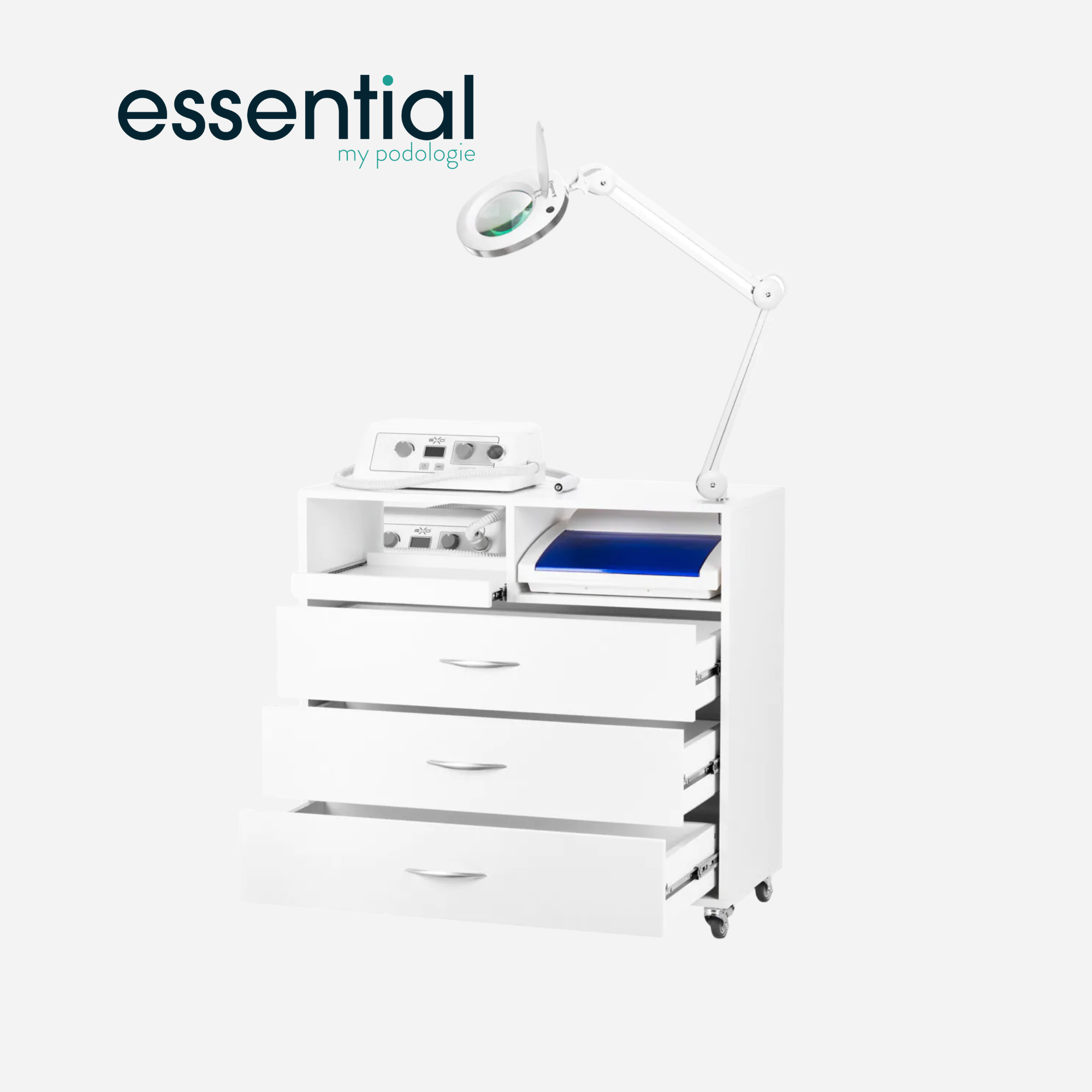 Caractéristiques générales : • Ensemble de podologie complet et ergonomique pour soins professionnels • Poste de travail mobile, fonctionnel et polyvalent • Conçu pour optimiser le confort du praticien et la précision des soins • Meuble robuste avec trois tiroirs spacieux pour le rangement des accessoires • Étagère coulissante intégrée pour accueillir un micromoteur ou stérilisateur • Structure montée sur roulettes pour une mobilité facile entre les salles • Matériaux durables, résistants et faciles à nettoyer • Support TUBE permettant de fixer la lampe directement sur le plan de travail